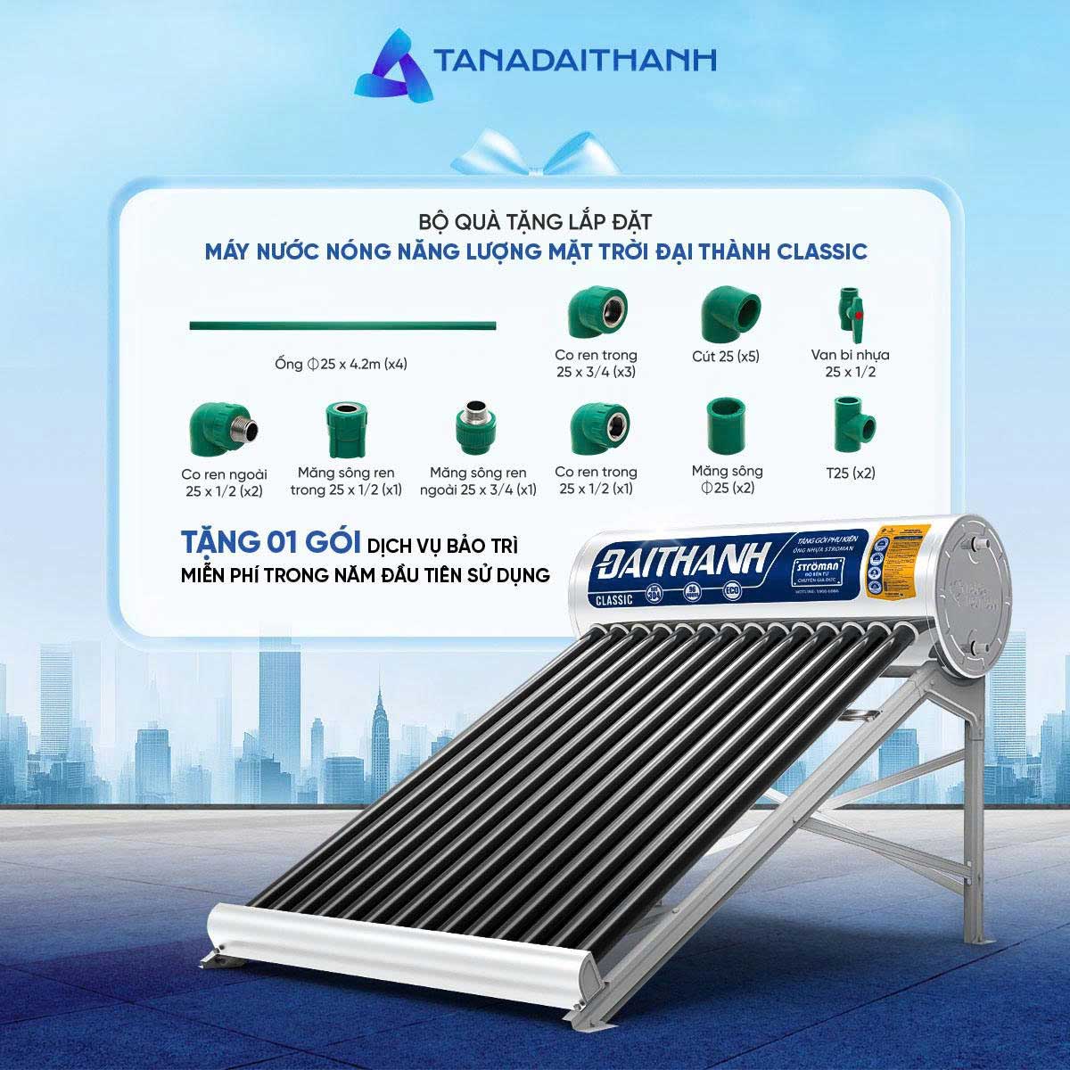 Chi phí lắp đặt máy nước nóng năng lượng mặt trời Đại Thành phụ thuộc vào dung tích máy, khu vực lắp, vật tư đường ống và dịch vụ thi công, nhưng nhìn chung một hệ thống hoàn chỉnh cho gia đình 3–5 người thường dao động trong khoảng từ 6 – 10 triệu đồng trở lên nếu tính cả máy, bồn, ống và công lắp.
